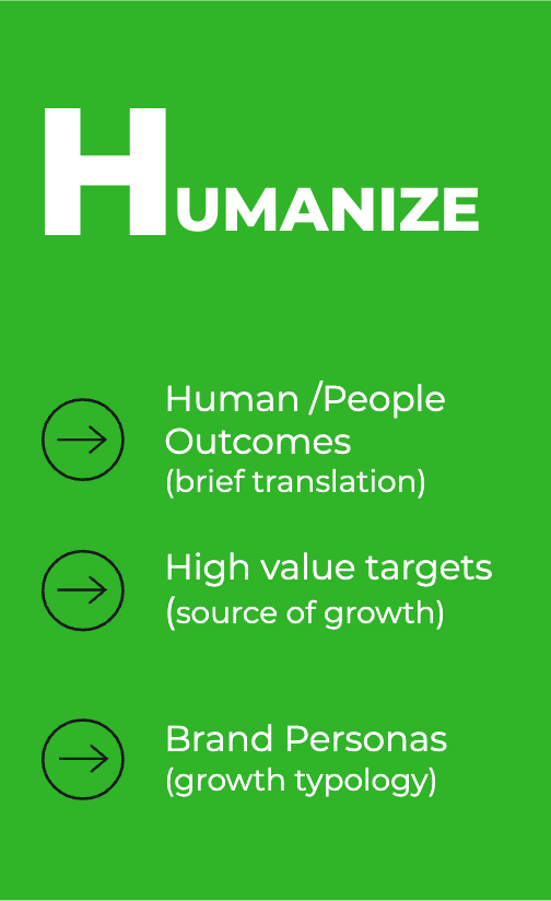 HUMANIZE - We dive deeply into what individuals truly value from a brand to win a coveted place in consumers' hearts and wallets. By understanding unique motivations, we can design targeted and personalized media experiences that drive discovery, preference, and consumer loyalty.