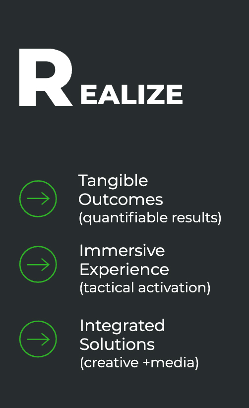 REALIZE - We connect multiple partners and platforms to create a multi-dimensional experience that captivates consumers, forging exclusive partnerships to craft moments that are truly unforgettable. These moments transport brands into the consumer’s world and leave a lasting impression.